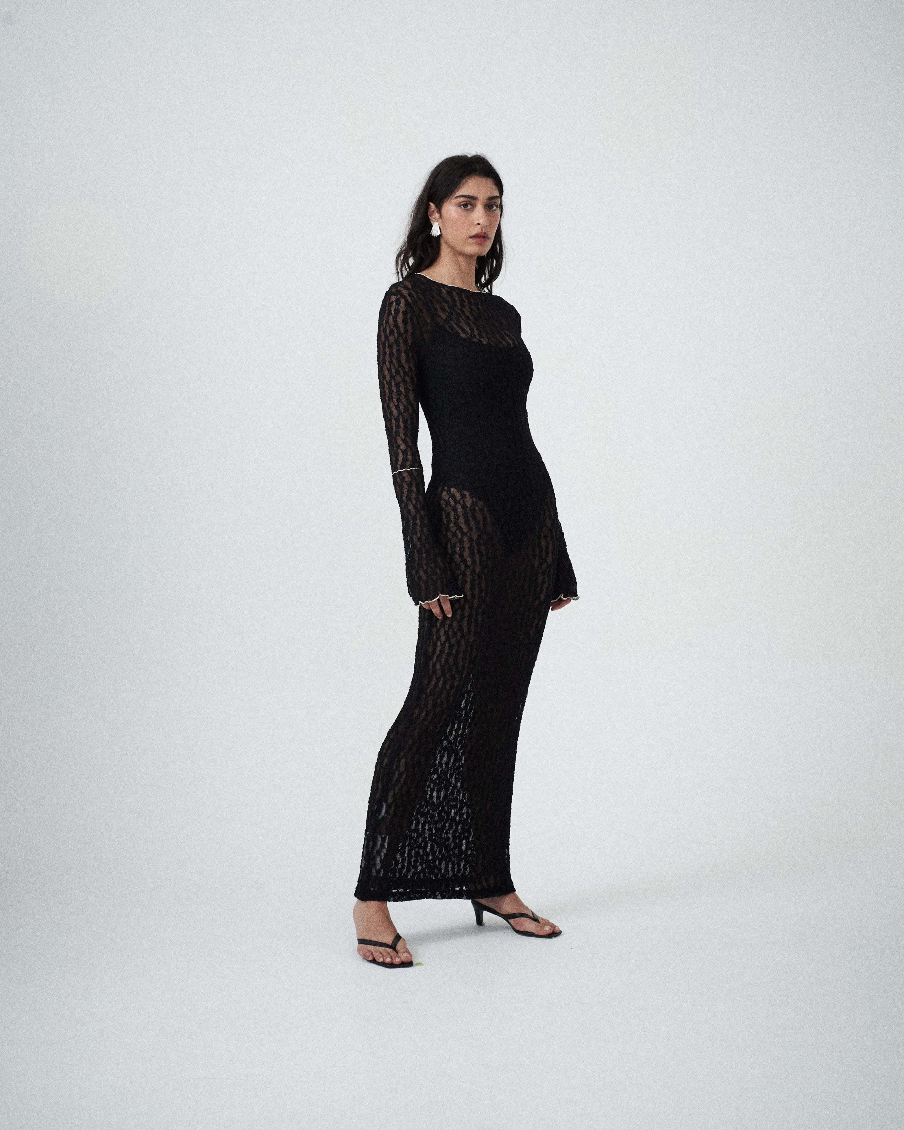 Command attention with the VARNA Cecil Maxi Dress — a stunning black lace dress that fuses daring style with refined elegance. Crafted from intricate floral lace, it features a semi-sheer design and body-skimming silhouette that moves fluidly with every step. Long sleeves with delicate trim detailing add structure and sophistication, while the maxi length elongates the form.