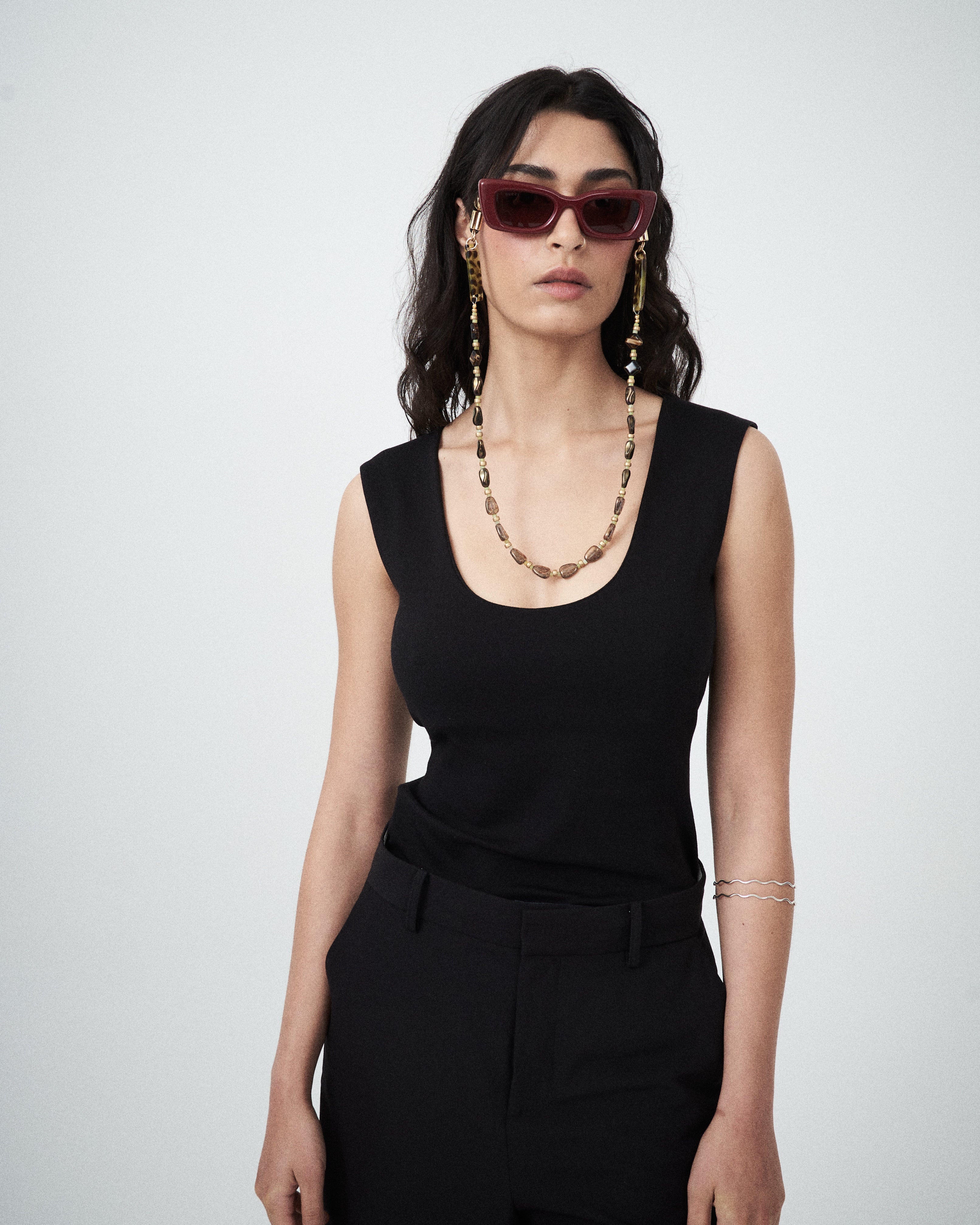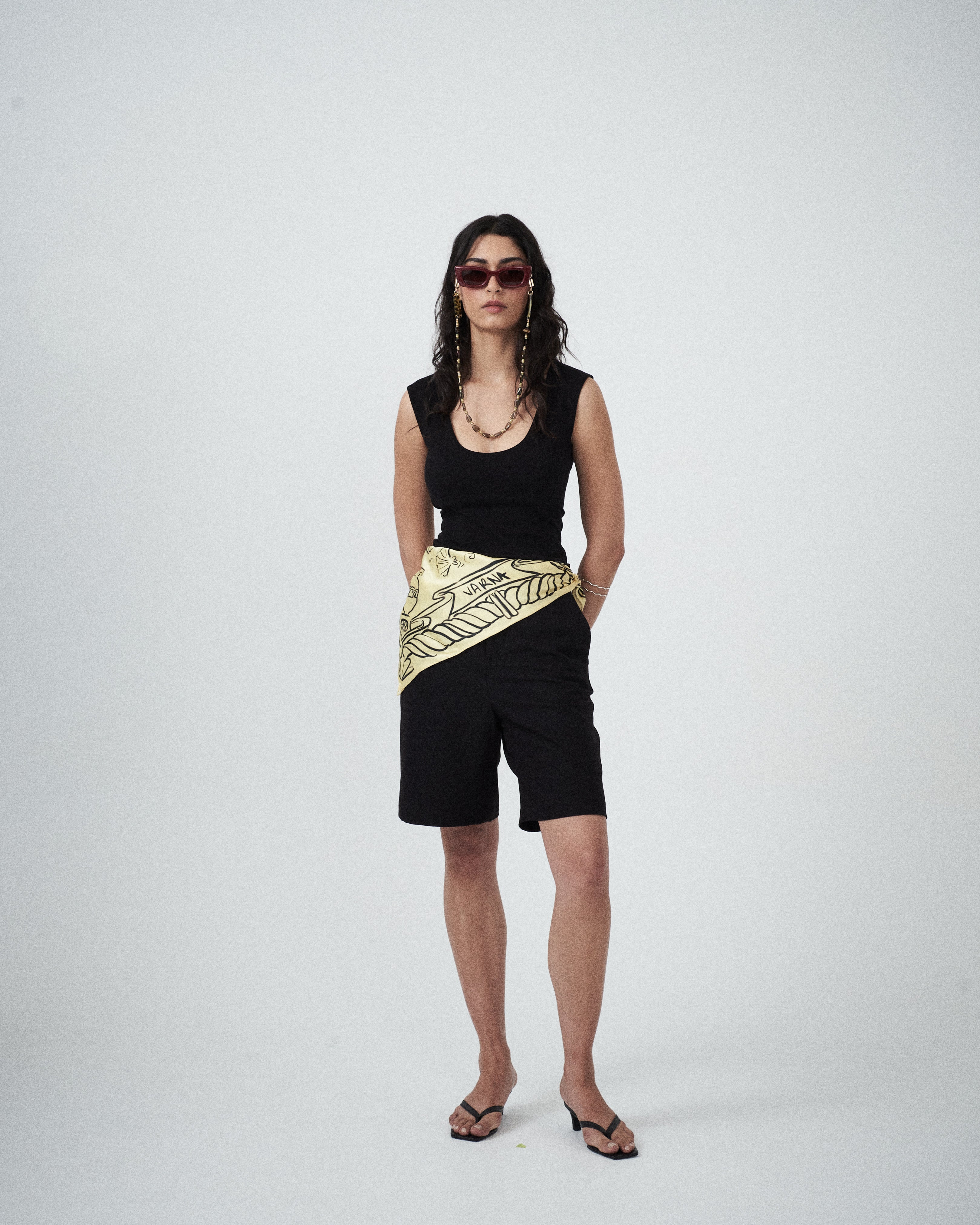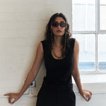 A refined essential designed for the everyday muse. This sculpted Jersey top frames the body with ease, featuring a deep rounded neckline and a close, confident fit. Thoughtfully constructed with an internal shelf bra for subtle support, it blends softness with structure — a quiet assurance beneath its minimalist silhouette.