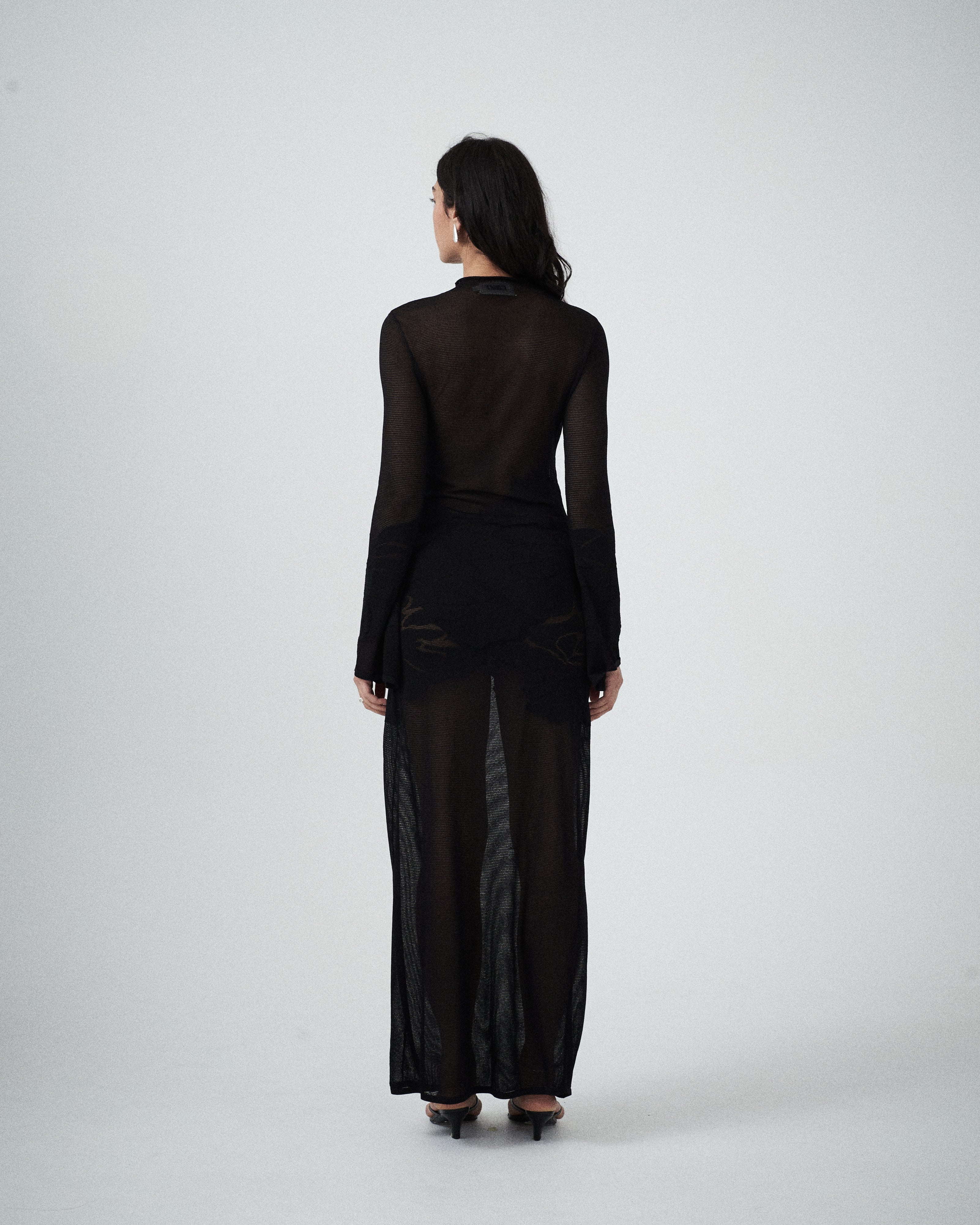 Designed for those who command attention with quiet confidence, the VARNA Seraphine Knit Maxi Dress redefines evening elegance. Crafted from a lightweight sheer knit in black, it features tonal floral detail that add subtle texture and artistry. The fabric drapes fluidly over the body, creating a silhouette that moves with ease. Long sleeves and a high neckline lend soft drama, balancing allure with sophistication. Perfect for evenings that linger in memory, this piece embodies VARNA’s signature blend of modernity and grace.